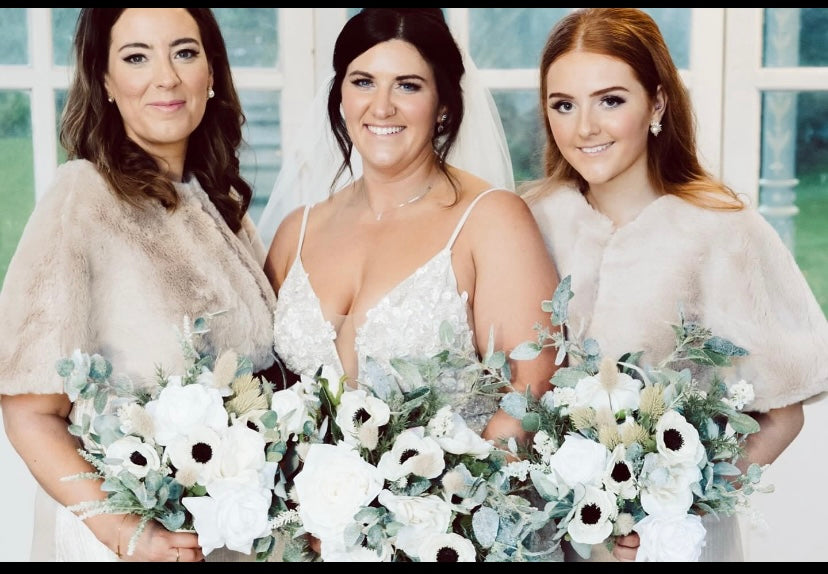 Perfectly paired with the brideβs bouquet, the bridesmaidsβ bouquets are equally captivatingβsmaller versions of the bridal bouquet, with matching blooms and delicate greenery, designed to complement the bride's vision while giving each bridesmaid a unique, yet cohesive, look. These petite creations are light, versatile, and striking, ensuring your bridal party radiates beauty as they walk down the aisle.